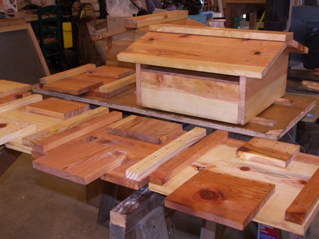 Take all of the Warre hive components you have built and lay them on some cardboard, newspaper or scrap wood. You can stack the hive boxes if you have more than one. You can also lay thin strips of across two saw horses to provide a place to paint the roof and floor as in the photo above. The quilt does not need to be painted.